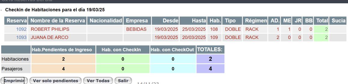 Al ingresar en dicha pantalla se puede emir los checkin del día y en forma paralela sacar la tarjeta de registro de cada Reserva con la finalidad de que los huéspedes completen sus datos en el momento del checkin.