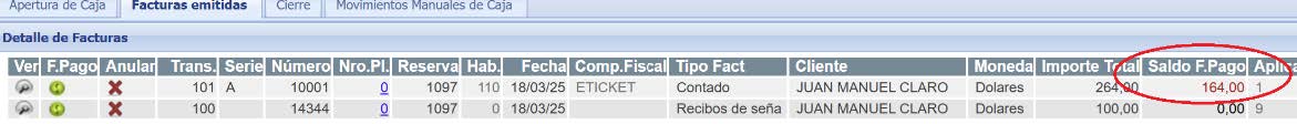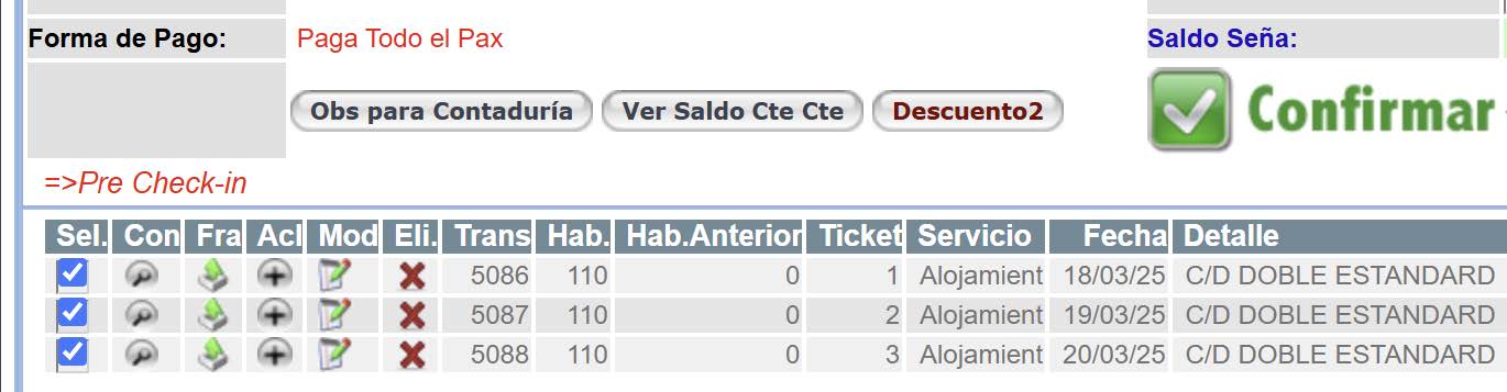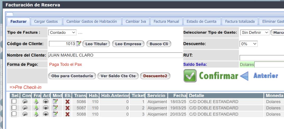 Luego una vez identificada la Reserva se debe presionar el icono Fact. Al presionar dicho icono se despliegan todos los gastos sin facturar de la habitación