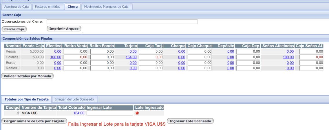 En dicha pantalla se debe cargar el numero de lote de cada tipo de tarjeta y luego cargar el importe Retiro Venta para el efectivo, los montos de tarjeta si corresponde, cheque y depósito.