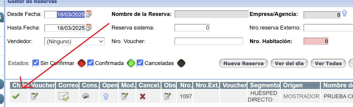 En el caso de hacerlo desde el gestor se debe ingresar al Gestor, buscar la reserva y luego presionar el icono de Checkin.