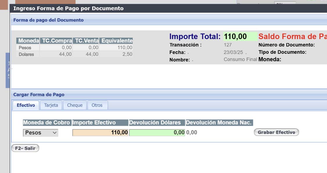 Cerrar la mesa y luego facturar dicho consumo en forma contado con medio de pago Efectivo.
