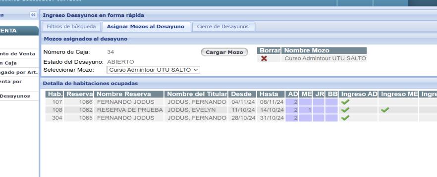 Se despliegan todas las habitaciones ocupadas y para cargar el desayuno se debe