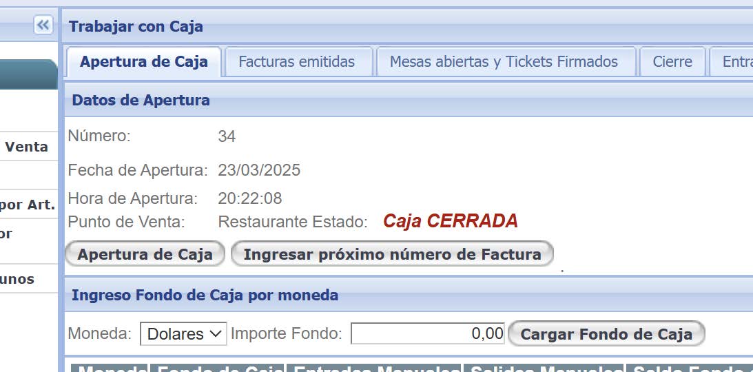 Apertura de Caja, si la caja ya está abierta dicho botón no se encuentra disponible.