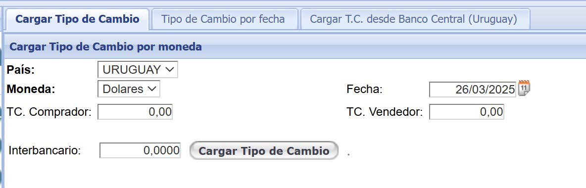 Se debe seleccionar la moneda, fecha y luego completar los 3 tipos de cambio y presionar el botón Cargar Tipo de Cambio.