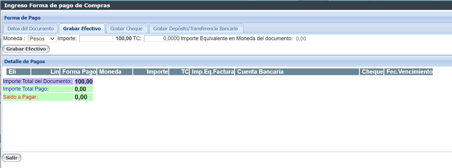 - Aquí en esta pantalla debemos indicar al sistem como fue que le pagamos a este proveedor.