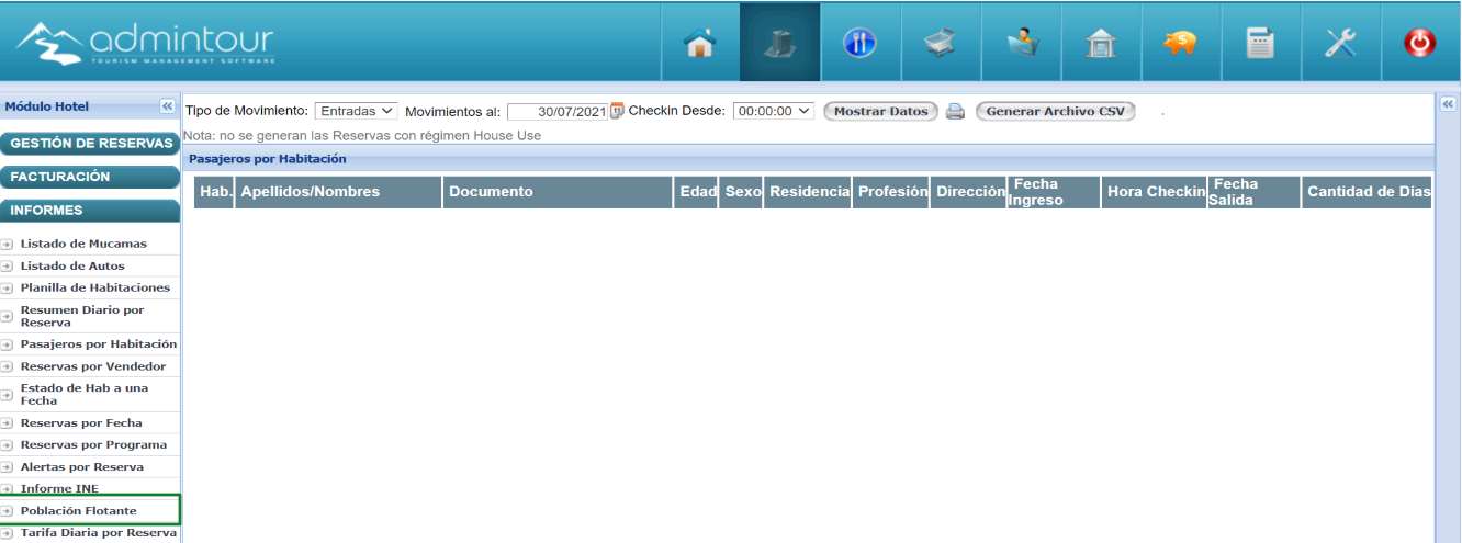 Ir a: Modulo del Hotel > Menú > Informes > Población Flotante