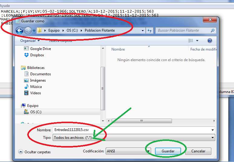 Desde el block de notas hay que grabar dicho archivo con un nombre relacionado a la fecha por ejemplo entradas11122015.csv
